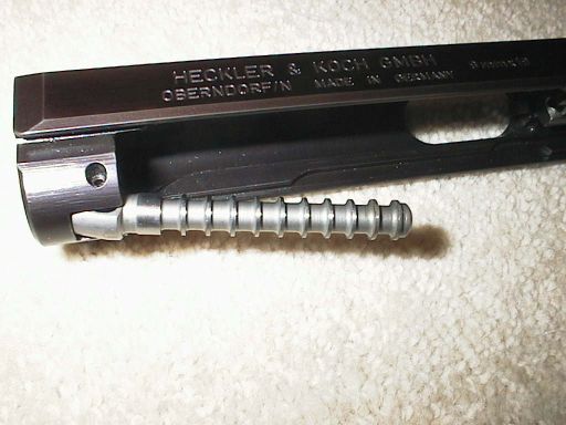 The German police specifications called for a compact 9mm pistol, which was quite a novel idea for the time, and the manufacturers competing for the contracts had difficulty coming up with something short enough that would work reliably. However, there is nothing a German engineer likes more than a challenge! H&K solved the problem by using a method of operation known as gas-retarded blowback, as far as I know the first pistol to successfully use it. In terms of operation, in front of the chamber is a small hole. Upon firing, expanding propellant gases flow into this hole under pressure, and bear against a piston that rides under the barrel and is attached to the slide. This pressure prevents the slide from opening violently, a problem with straight blowback 9mm pistols, especially compact ones. By the time the pressure dissipates, it is safe for the slide to open, and the ordinary functions of ejecting the cartridge case and feeding a new round into the chamber take place. This is the gas piston: