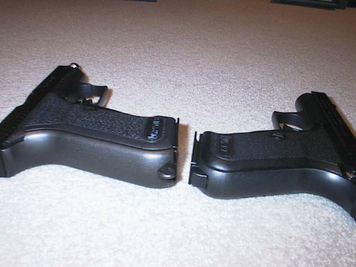 The other gun in the P7 series is the P7M10, the .40S&W version of the P7. This gun used the frame of the P7M13, a barrel with a bigger hole through it and an absolutely whopping big slide to tame the high-pressure round. Although you often meet H&K fans who think it was a great gun, in reality it was a lemon, being simply too massive and heavy. This was odd, because the prototype guns had a similar sized slide to the P7M13. Why this happened is open to conjecture, however the story I heard is that the prototype model used a differently sized (presumably smaller) gas port and different gas piston to the M13. To make the P7M10 with that port and piston required expensive retooling, which H&K were unwilling to do as they had the USP in development at the time. So they simply piled more ordnance steel into the slide.